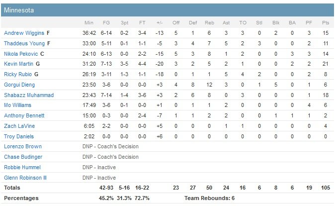 À noter qu’incertain avant le match, Jeff Teague (cheville) termine à 12 points et 7 passes en 32 minutes. Ricky Rubio a connu de son côté une soirée difficile avec 8 points à 3/11 et 5 passes en 26 minutes de jeu.