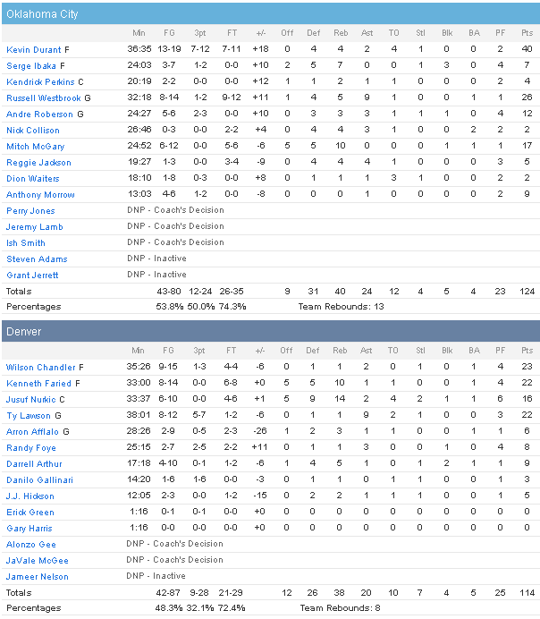 Le rookie Mitch McGary a encore été excellent pour épauler les stars avec 17 points et 10 rebonds en 25 minutes alors qu’Andre Roberson ajoute 12 points. Le Thunder a shooté à 53.8% dont 12/24 à trois points, rendant la tâche très difficile aux Nuggets, moins en réussite à l’extérieur (9/28). Ty Lawson et Kenneth Faried signent 22 points chacun, Wilson Chandler 23 et Jusuf Nurkic 16 points et 14 rebonds, mais ils n’ont pu empêcher cette 13ème défaite en 14 matchs.