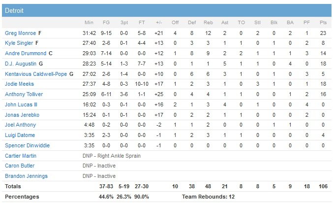 L’intérieur des Pistons (qui compte 16 victoires pour 9 défaites lors de leurs 25 derniers matchs) signe 23 points à 9/15 et 12 rebonds alors que D.J. Augustin ajoute 18 points à 5/14 et 5 passes pour infliger aux Hornets leur troisième défaite de rang. Monroe a enregistré 20 points et rebonds 48 fois depuis la saison 2011-2012, personne n’a fait mieux dans la Conférence Est sur cette période. Dominants à l’intérieur, les Pistons prennent l’avantage au rebond (48-38) alors qu’Andre Drummond ajoute 14 points et 9 rebonds. Leur engagement défensif leur permette de rapidement mener de 23 points à la fin du troisième quart-temps, sans plus jamais être inquiétés.