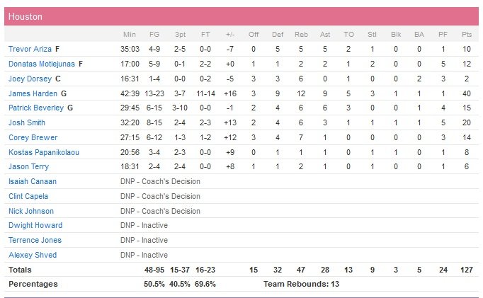 Harden  prend rapidement feu dans le premier et deuxième quart-temps avec un 3-points (Houston passe un 15-5 à ses adversaires après avoir manqué 9 shoots consécutifs pour reprendre le contrôle du match) , puis démarre le 4e (durant lequel il shoote à 7/10 et l’équipe à 15/20) sur un 3+1 qui place Houston (50.5% de réussite contre devant 47.1 pour les Suns) pour de bon. Bledsoe réduit l’écart sur un 3-points (96-95) mais Smith et Corey Brewer lui répondent par un tir primé chacun. Le 3-points plus la faute d’Harden permet ensuite à Houston de reprendre une avance correcte, 104-95. Il marque ensuite 8 points consécutifs en deux minutes et demi en fin de quart-temps pour mettre définitivement son équipe à l’abri. Il s’agit de son 6e match à au moins 40 points (il avait marqué 45 points dans une défaite face à Portland, dimanche).