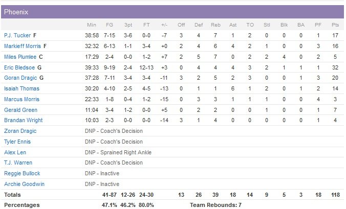 Josh Smith ajoute à cela 20 points à 8/15 6 rebonds et 3 passes en sortie de banc pour faire face au meilleur match en carrière au niveau du scoring d’Eric Bledsoe, qui termine à 32 points à 12/19, 4 rebonds et 4 passes. Phoenix (qui s’était pourtant remis d’un déficit de 18 points après un 20-3 et qui avait pris la tête du match 89-88 à la fin du troisième quart) termine donc sa première partie de saison sur une 5e défaite en 6 matchs.