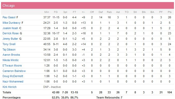 En plus d’un Pau Gasol à 26 points à 11/15 et 16 rebonds cette nuit, les Bulls ont aussi pu compter sur 24 points à 9/11 et 4/6 à 3-points (record en carrière) de Tony Snell et 23 points à 10/17 et 7 passes de Derrick Rose dans troisième victoire consécutive de Chicago (33V-20D), cette fois face à Sacramento.