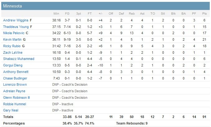 L’arrière (qui sera titulaire dimanche lors du All-Star Game en compagnie de James Harden) a néanmoins connu une soirée difficile avec 14 points à 5/14. Stephen Curry signe lui 25 points à 9/23, 8 passes et 5 rebonds, Andrew Bogut est en double-double avec 10 points à 5/10 et 10 rebonds mais Draymond Green et Harrison Barnes combinent pour un petit 4/13 aux tirs. Golden State reste 1er de la Conférence Ouest avec 42 victoires pour 9 défaites et une troisième victoire consécutive. En face Kevin Martin et Ricky Rubio mènent la danse avec respectivement 21 points et 18 points, 9 rebonds et 5 passes pour les Wolves (11V-42D), qui sont revenus à égalité en fin de match après avoir rattrapé 14 points de retard.
