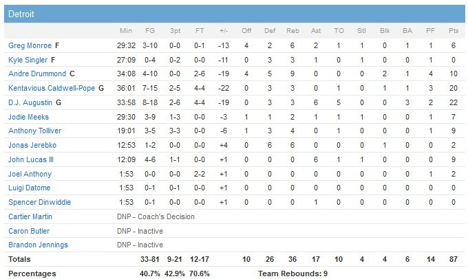 D.J. Augustin continue à combler le vide laissé par Brandon Jennings à la mène pour Detroit avec 22 points à 8/18 et 6 passes, Kentavious Caldwell-Pope le suit avec 20 points à 7/15 mais c’est à l’intérieur que cela pèche pour les locaux. Greg Monroe termine à 6 points à 3/10 et 6 rebonds et Andre Drummond est lui limité à 10 points à 4/10 et 9 rebonds. San Antonio défend bien dans la peinture et fait la course en tête 48-39 à la pause (et ce malgré un buzzer du milieu du terrain de John Lucas III et un duo Tim Duncan / Kawhi Leonard à 0/10) puis démarre son troisième quart-temps par un 16-7.