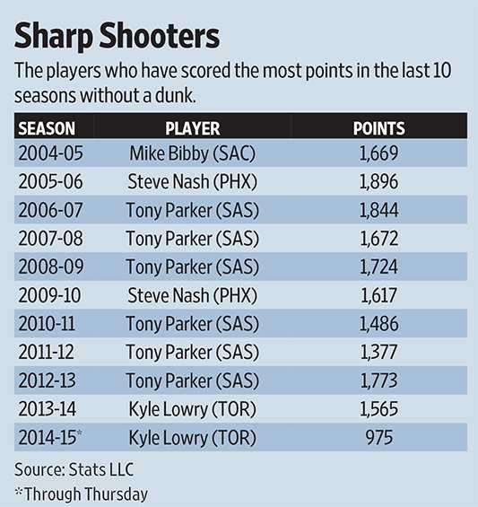En NBA le spectacle est très souvent associé aux dunks et encore plus à cette période de All-Star Weekend avec le concours de dunks et le All-Star Game où on attend des envolées folles. Pourtant il y en a certains dont ce n’est pas la spécialité puisque la saison passée par exemple 17% des joueurs avec un temps de jeu significatif n’ont pas dunké. C’est le cas de Kyle Lowry, titulaire au All-Star Game, et qui n’a plus dunké depuis 2008. De même pour Kyle Korver malgré sa taille plus avantageuse, qui a dunké à deux reprises cette saison mais qui ne l’avait pas fait depuis 2012. Et ces joueurs ont tendance à se rappeler de leurs rares dunks comme si c’était hier