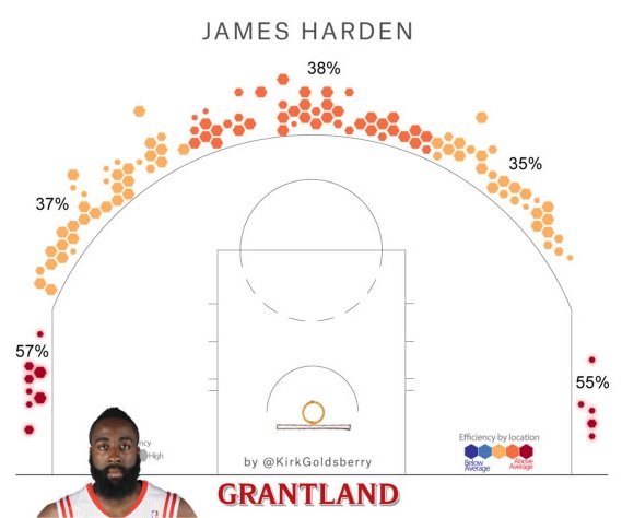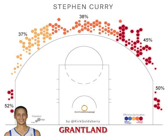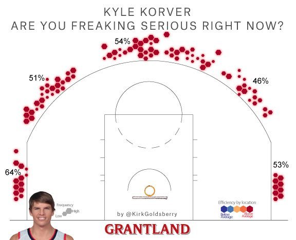 A la veille d’un concours de tirs à trois points qui est attendu comme jamais, Kirk Goldsberry nous propose de faire un point sur la saison des 8 shooteurs pour voir qui est le favori selon les stats. Il a bien sûr mis l’accent sur les positions dans lesquelles les racks de ballons sont placés. Un favori se détache clairement et ce n’est pas surprenant, c’est Kyle Korver. Sur les 5 positions il affiche un pourcentage assez incroyable avec une seule position où il shoote à moins de 50%, à 45° sur la gauche du panier. Il affiche notamment une adresse surréaliste de 64% dans le corner droit.