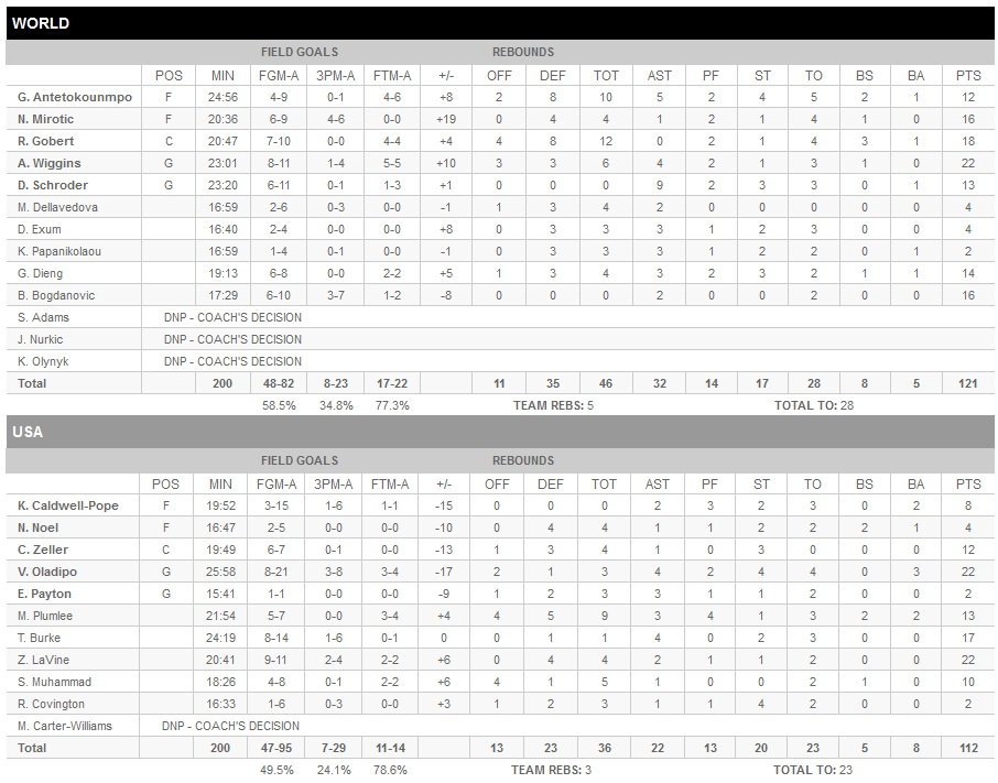 Cinq autres joueurs dépassent les 10 points pour les « World » : Giannis Antetokounmpo (12 points 10 rebonds 5 passes), Nikola Mirotic (16 points), Dennis Schröder (13 points), Gorgui Dieng (14 points) et Bojan Bogdanovic (16 points). En face Victor Oladipo (8/21) et Zach Lavine (9/11) terminent tous deux à 22 points, suivis par les 18 points de Trey Burke.