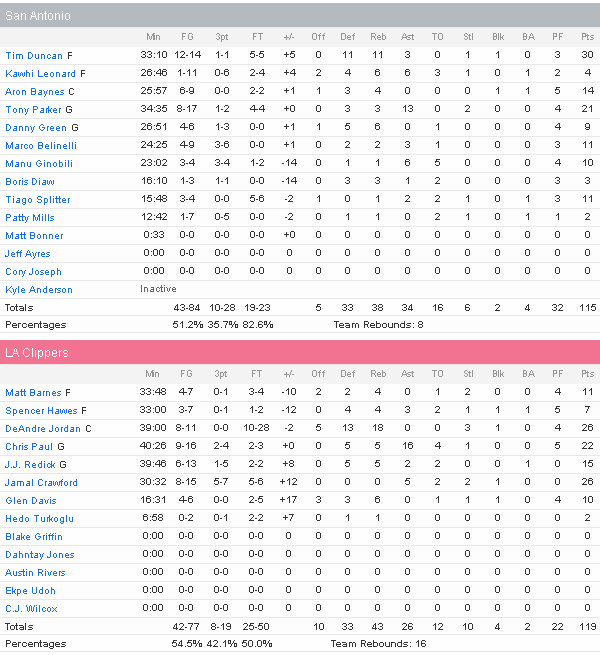 En face les Spurs ont affiché un niveau inquiétant hormis deux de leurs joueurs, le duo Tim Duncan (30 points à 12/14 et 11 rebonds) et Tony Parker (21 points à 8/17 et 13 passes) qui les ont portés toute la rencontre. Mais dans le money time la stratégie de Gregg Popovich de faire faute systématiquement sur Jordan n’a pas payé puisqu’ils ont été incapables de profiter des lancers manqués. Kawhi Leonard passe totalement à côté de son match avec 4 points à 1/11, 6 rebonds et 6 passes et les arrières Danny Green (9 points), Marco Belinelli (11 points), Patty Mills (2 points à 1/7) et Manu Ginobili (10 points à 3/4, 6 passes et 5 ballons perdus) ont été très discrets. Les Spurs ont toutefois shooté à 51.2% mais perdu 16 ballons et concédé 50 lancers francs (25/25) et laissé les Clippers shooter à 54.5%, pas digne de la défense d’un champion en titre.