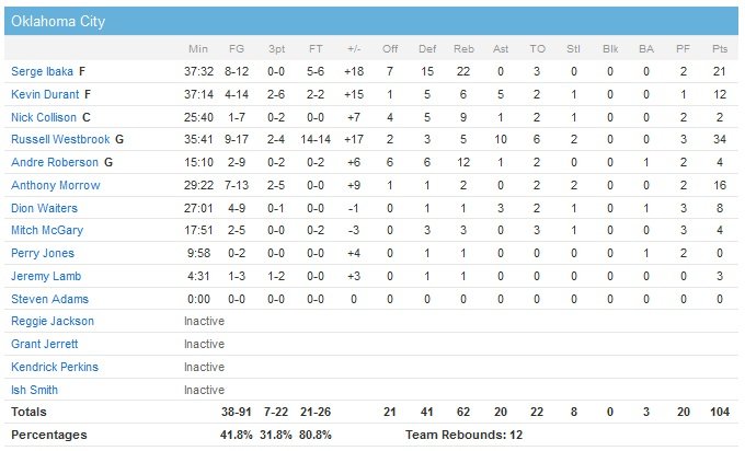 Morrow est chaud et bien servi en début de match avec 14 points en première mi-temps (6/11). C’est lui qui donne 17 points d’avance à OKC sur un 3-points au buzzer du deuxième quart-temps, 52-36. Le Thunder maintient Dallas à 29% avant la pause tout en forçant 13 pertes de balles de ses adversaires. Westbrook fait en sorte que l’équipe ne se repose pas sur ses lauriers dans le troisième quart avec 15 points dans la période et sa 8e passe décisive de la soirée permet à Ibaka d’offrir 22 points d’avance aux locaux, 58-36. À la fin de la période, le MVP du All-Star Game compte 26 points et 9 passes et son équipe est toujours largement devant, 83-65. Dallas (qui jouait sans sa nouvelle recrue Amar’e Stoudemire) franchira la barre symbolique des 10 points de retard sur un 3-points d’Al Farouq-Aminu en début de quatrième quart-temps mais ce semblant de comeback n’ira pas plus loin, Westbrook continuant à se balader dans la raquette des Mavs avec 4 layups réussis dans les 5 grosses dernières minutes du match.