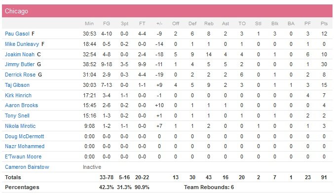 Les 30 points de Jimmy Butler seront inutiles à Chicago, alors que Joakim Noah enregistre un double-double solide dans la raquette (10 points et 14 rebonds). Opposé à Dinwiddie, Derrick Rose était étonnamment en difficulté avec seulement 8 points et 2 passes en 31 minutes de jeu. Drummond score 10 points dans les 22 premières minutes de jeu mais Chicago, qui peut davantage compter sur son banc (19 points à 8), reste devant à la pause (53-45) grâce aux 27 points de Butler et Taj Gibson (13 points à 6/11 sur le match) combinés.