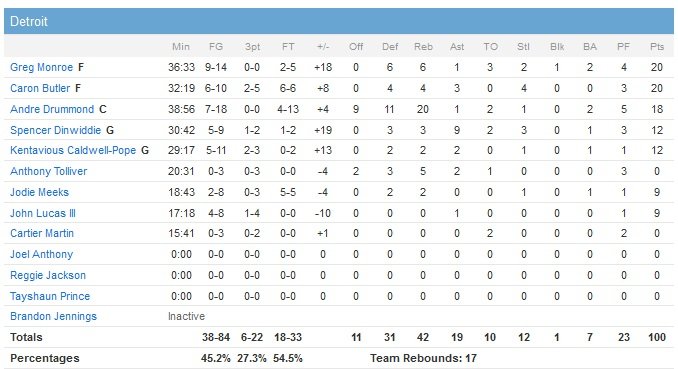 Grosse performance des Pistons (réduits à 10 joueurs) cette nuit, portés par les 18 points (7/18, 4/13 aux lancers-francs) et 20 rebonds (dont 14 en première mi-temps) d’Andre Drummond et qui s’imposent 100-91 face aux Bulls au Palace of Auburn Hills. Greg Monroe et Caron Butler ajoutent chacun 20 points alors que pour sa première titularisation en carrière (Reggie Jackson, fraîchement transféré, était en costume, tout comme Tayshaun Prince), le meneur rookie Spencer Dinwiddie marque 12 points et distribue 9 passes.