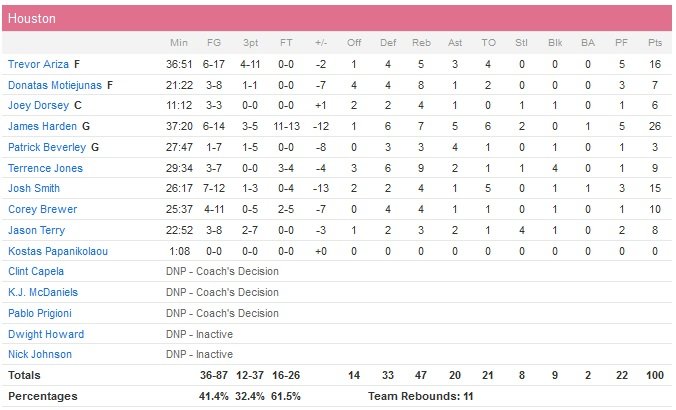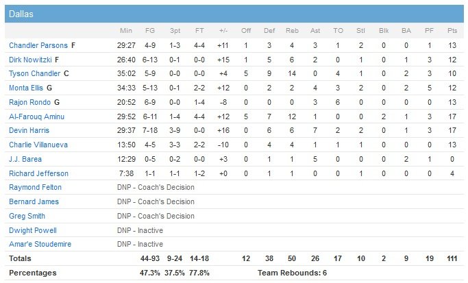 Rajon Rondo signe 13 points à 6/9 et 3 passes alors que Charlie Villanueva rentre ses trois tentatives à 3-points, pour 13 points et quelques paniers importants pour aider Dallas à tenir. Menés 54-43 à la pause, les Rockets (21 pertes de balles contre 17 pour Dallas), leaders au nombre de trois-points inscrits par match, sont limités à un petit 29% de réussite de loin avant de jouer le dernier quart-temps et d’enfin régler la mire pour réduire l’écart, monté jusqu’à 87-67 en faveur des hommes de Rick Carlisle au terme du troisième quart-temps. Menés de 5 points, les Rockets encaissent un 10-2 initié par un layup de Monta Ellis (12 points à 5/13, 4 passes)et le score passe de 98-93 à 110-96 en faveur des locaux suite à deux lancers-francs d’Aminu pour sceller la victoire des siens à 46 secondes du terme.
