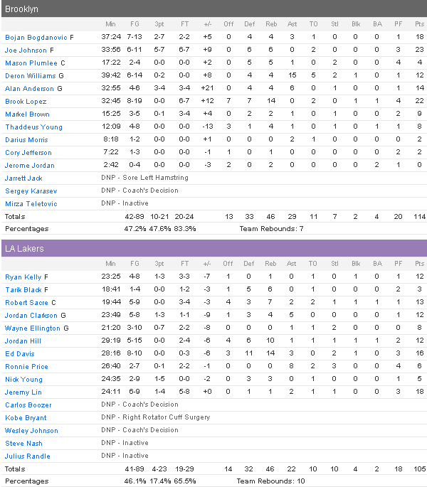 Bonne nouvelle pour les Nets puisque ce sont leurs All-Star Deron Williams (12 points et 15 passes), Joe Johnson (23 points à 6/11) et Brook Lopez (22 points et 14 rebonds en sortie de banc) qui ont été les leaders, avec l’aide également de Bojan Bogdanovic (18 points). Face à une défense des Lakers encore en difficulté, les Nets en ont profité pour jouer un joli basket avec pas moins de 29 passes décisives avec 47.2% aux tirs dont un 10/21 à trois points. Thaddeus Young a lui fait de bons débuts avec 8 points à 4/8 et 4 rebonds en 12 minutes. En face Jeremy Lin termine avec 18 points dont 11 dans le dernier quart pour donner espoir aux Lakers mais ça n’a pas été suffisant. Ed Davis ajoute 16 points et 14 rebonds, Jordan Hill (10 rebonds), Jordan Clarkson et Ryan Kelly 12 et Robert Sacre 13.