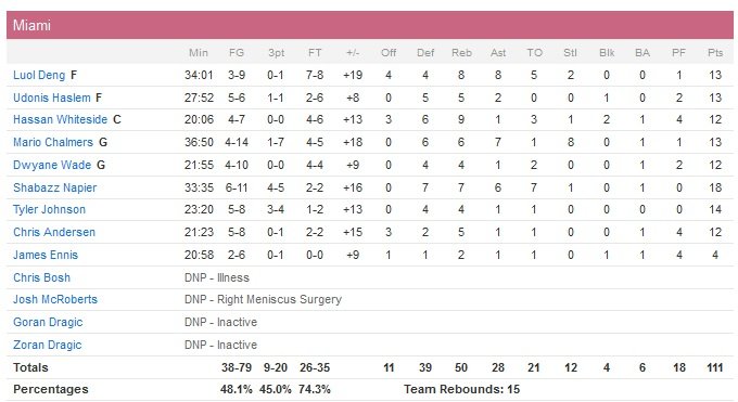 Huit des neuf joueurs du Heat marquent au moins 10 points et Dwyane Wade score 12 points après 7 matchs d’absence (ischio). Shabazz Napier termine meilleur marqueur de Miami avec 18 points, 7 rebonds et 6 passes. Suffisant pour affronter une équipe de New York privée de Carmelo Anthony (opéré du genou) et Amar’e Stoudemire, parti à Dallas. Et c’est comme d’habitude Langston Galloway qui sauve les meubles pour les Knicks, derniers de la ligue avant le All-Star break avec 10 victoires pour 43 défaites, avec 19 points mais une 6e défaite consécutive à la clé.