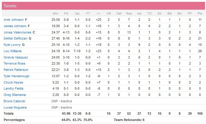Malgré le bilan des Hawks (qui ont perdu 4 de leurs 7 derniers matchs après leur série historique de 19 victoires consécutives) nettement supérieurs sur le papier, les Raptors ont remporté trois de leurs quatre confrontations avec leur rivaux d’Atlanta cette saison (3V-1D). Aucune autre équipe ne compte deux victoires contre eux cette saison. Paul Millsap, Kyle Korver et Jeff Teague ne marquent que 11 points chacun et sont malgré tout co-meilleurs marqueurs de leur équipe.
