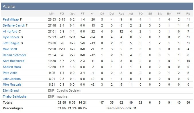 Devant 49-45 à la mi-temps, les Raptors vont mettre tout le monde d’accord avec un troisième quart-temps ultra-dominateur (5 contres et 7 interceptions pour eux dans ces 12 minutes) remporté 28-13 et qui va leur permettre de prendre jusqu’à 23 points d’avance. Durant cette période, Atlanta ne rentre que 3 de ses 19 tentatives, mention spéciale pour Korver, qui rate ses cinq shoots tout en perdant deux ballons. Mike Budenholzer décide donc logiquement de reposer ses titulaires pour le dernier quart en faisant entrer Mike Muscala, John Jenkins et Shelvin Mack pour terminer la rencontre.