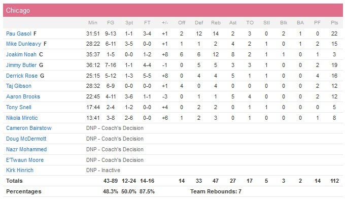 Cinquième victoire en six matchs pour les Bulls cette nuit grâce à leur succès 112-107 face aux Suns. Porté par l’excellent Pau Gasol (22 points à 9/13, 14 rebonds et 2 contres), Chicago (3e de la Conférence Est avec un bilan de 35 victoires pour 21 défaites) a réalisé un match équilibré avec également 19 points de Jimmy Butler, 16 de Derrick Rose, 15 de Mike Dunleavy Jr ou encore 12 points pour Taj Gibson et Aaron Brooks.