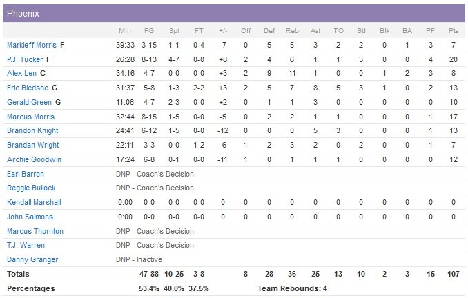 Phoenix recolle à 106-104 sur un layup d’Eric Bledsoe (13 points à 5/8, 8 passes et 7 rebonds) à 49.8 secondes restantes suite à une mauvaise passe de Noah à Rose et une interception de P.J. Tucker (20 points à 8/13, 6 rebonds) mais Gasol trouve un hook qui redonne 4 points d’avance aux Bulls. Markieff Morris lui répond avec un 3-points qui replace les Suns en tête, 108-107, à 25.9 secondes. Rose rentre deux lancers-francs après une faute de Marcus Morris à 15.5 secondes et après un pullup manqué de Bledsoe à 3-points, Butler inscrit deux lancers supplémentaires pour sceller la victoire.