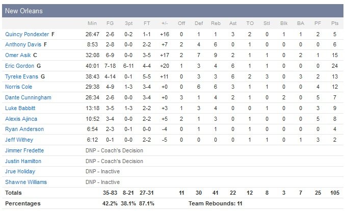 Miami, qui a a annoncé le forfait pour le reste de la saison de Chris Bosh (embolie pulmonaire) quelques heures avant le match, est mené par les 20 points de Mario Chalmers (qui démarre son match sur un 7/7 pendant que ses coéquipiers shootaient à 3/21) durant une soirée qui marquait également les débuts de Goran Dragic (12 points à 4/11 et 3 rebonds, le Slovène n’a pas encore eu le temps d’apprendre les systèmes) et le retour de Norris Cole à l’American Airlines Arena. Dwyane Wade marque 19 points alors qu’Hassan Whiteside termine à 11 points et 16 rebonds pour Miami, qui conserve sa 7e place de la Conférence Est malgré cette défaite. Davis, 4e meilleur scoreur NBA, sort sur blessure et en grimaçant à 3″07 de la fin du premier quart-temps, quelques instants après une tentative de shoot en contact avec Whiteside. Son coéquipier Anderson rejoindra lui aussi les vestiaires quelques minutes pus tard, en raison d’une entorse au genou droit.