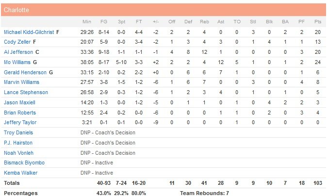 Une première victoire depuis le transfert de Reggie Jackson et Kendrick Perkins qui fait de l’ombre aux premiers pas réussis de Mo Williams sous le maillot des Hornets. Transféré de Minnesota, Williams inscrit 24 points à 8/17 et distribue 12 passes. Malgré les 20 points 12 rebonds d’Al Jefferson et les 20 points de Michael Kidd-Gilchrist, les Hornets (qui perdent là leur 4e match consécutif) sont largement dominés au rebond avec un avantage 59-41 pour OKC. Charlotte va compter jusqu’à 12 points de retard dans le troisième quart-temps mais va se battre pour égaliser à 94 partout en milieu de quatrième quart-temps grâce à cinq trois-points signés Williams. Westbrook lui a répondu avec trois drives consécutifs pour redonner de l’air au Thunder 104-96 à 2″53 de la fin du math.