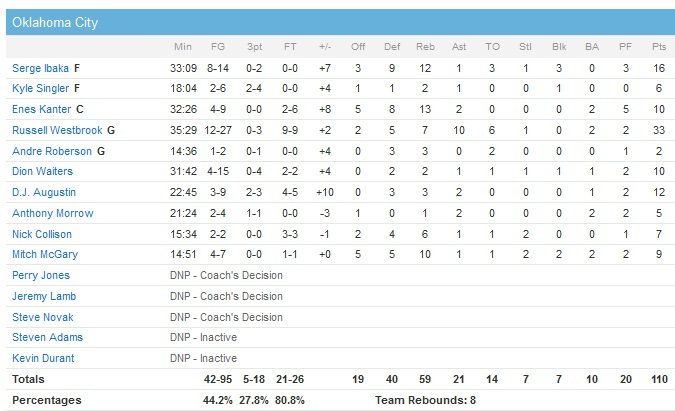 Kevin Durant mis au repos en raison d’un pied droit douloureux, Russell Westbrook (33 points à 12/27 et 9/9 aux lancers-francs, 10 passes et 7 rebonds) a mené le Thunder à une 5e victoire consécutive aux dépens de Charlotte (110-103) en compagnie de Serge Ibaka (16 points à 8/14 et 12 rebonds) et Enes Kanter (10 points à 4/9 et 13 rebonds), très efficaces dans la raquette avec un double-double chacun.