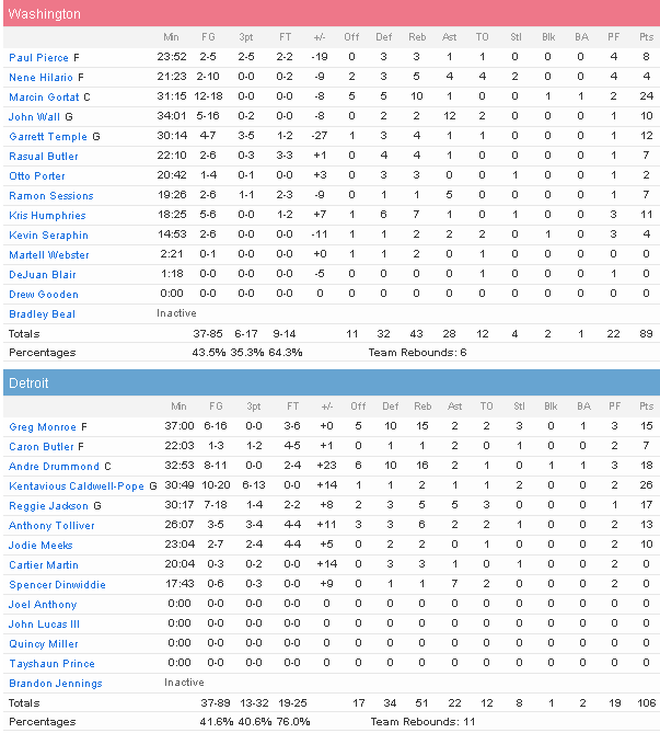 Detroit a fait basculer le match en troisième quart, remporté 35-19 avec un excellent Kentavious Caldwell-Pope, auteur de 26 points à 6/13 à trois points. Il a été épaulé par les intérieurs Andre Drummond (18 points, 16 rebonds) et Greg Monroe (15 points et 15 rebonds) et Reggie Jackson qui a connu un match à deux visages. Le meneur a très mal débuté en première mi-temps avant d’initier le bon troisième quart des siens. Il termine avec 17 points à 7/18 et 5 passes. Les Pistons ont construit leur succès sur leur présence au rebond (17 prises offensives) et leur adresse extérieure (13/32). Hormis un excellent Marcin Gortat (24 points à 12/18 et 10 rebonds), le reste du 5 majeur a été en difficulté pour Washington avec en combiné un 15/38 aux tirs dont 2/10 pour Nene (4 points) et 5/14 pour John Wall (10 points et 12 passes)