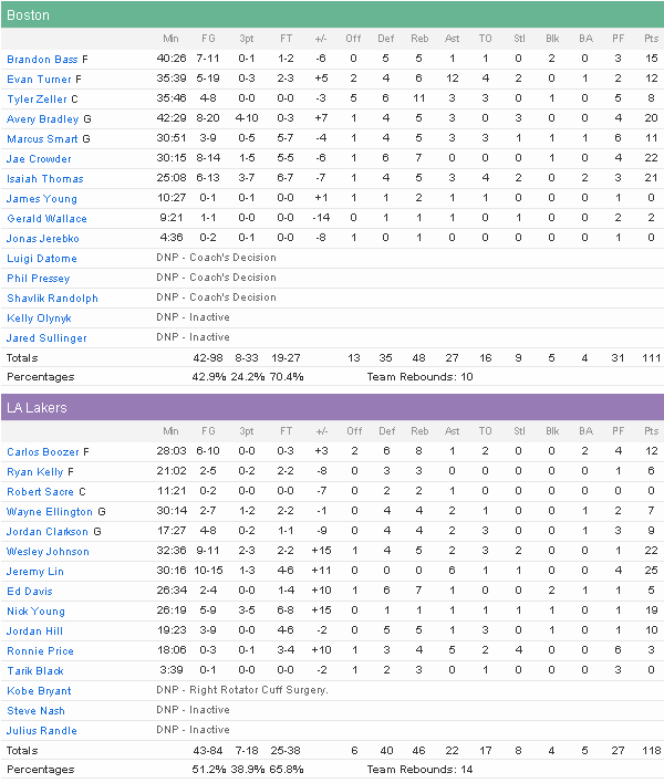 Jeremy Lin a été l’homme du match pour les Lakers avec 25 points, bien aidé par les 22 unités de Wesley Johnson et les 19 de Nick Young, tous les trois remplaçants. Les Lakers ont shooté à un excellent 51.2% sur le match et ont surtout pu compter sur un banc très performant qui inscrit 84 des 118 points de l’équipe. En face Isaiah Thomas faisait ses débuts et ils ont plutôt été réussis avec 21 points en 25 minutes mais malheureusement il a été expulsé pour deux fautes techniques à 5 minutes de la fin du temps réglementaire. Avery Bradley a pris le relais en inscrivant 8 de ses 20 points lors des 27 dernières secondes dont le tir à trois points au buzzer qui a envoyé le match en prolongation. Jae Crowder a lui ajouté 22 points en sortie de banc, mais les Celtics ont fini par payer leur 41.2% aux tirs et surtout leur panne d’adresse en début de prolongation.