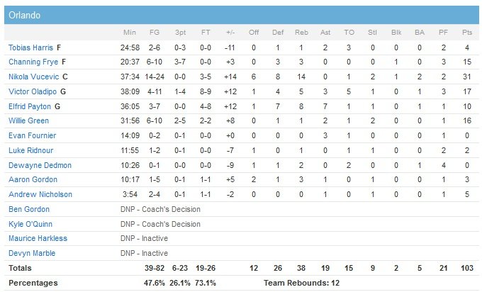 Drafté par Philadelphie en 2011, Nikola Vucevic a mené Orlando à la victoire (103-98) cette nuit avec 31 points (14/24) et 14 rebonds pour la première série de trois succès consécutifs du Magic cette saison, qui pourtant gâché 12 points d’avance dans les 5 dernières minutes du match. Victor Oladipo ajoute 17 points alors qu’Evan Fournier (0 point et 3 passes en 14 minutes) est relégué sur le banc en raison du retour de Tobias Harris (4 points à 2/6 et 2 passes en 24 minutes) à l’aile. Willie Green et Channing Frye apportent respectivement 16 et 15 points.