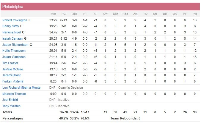 Depuis la prise de fonction de James Borrego, qui a déclaré vouloir construire une identité défensive avec son équipe, Orlando concède 10.7 points par match de moins que sous Jacque Vaughn, plutôt encourageant. Vucevic, transféré en août 2012 dans le cadre de l’arrivée de Dwight Howard à Los Angeles (4 équipes étaient concernées), prend 6 rebonds offensifs et participe à la domination totale dans la peinture du Magic (50 points à 26). Face à une défense de Philadelphie peu organisée, Frye rentre ses 5 premiers shoots (dont deux 3-points) et le Magic shoote à 52.3% en première mi-temps. Vucevic punit lui à l’intérieur avec 13 points sur les deux premiers quarts. Pas vraiment meilleurs en attaque, les 76ers perdent 13 ballons et ne se reposent quasiment que sur les 3-points, ce qui leur permet de ne pas trop prendre l’eau à la mi-temps, 55-47.