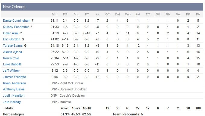 Ajinça score 10 points durant ses 12 premières minutes sur le terrain alors que Babbitt ajoute 8 de ses 18 points dans le deuxième quart, aidant New Orleans à tenir malgré un déficit conséquent, 56-44, à la pause. Valanciunas compte 13 points et Lowry 12 en première mi-temps alors que Toronto aura mené de jusqu’à 18 points, 51-33. Menés 62-49 à 8 minutes de la fin du troisième quart-temps, les Pelicans passent un 17-8 à leurs adversaires dans les 6 minutes qui suivent. La série est conclue par Eric Gordon (14 points 11 rebonds) à 3-points. Toronto reprend brièvement un avantage de 10 points sur un tir primé de Terrence Ross en début de quatrième quart-temps mais encore une fois, les Pelicans répondent par un 10-2, porté par les 7 points de Cole. New Orleans prend finalement pour la première fois l’avantage à 94-93, sur un 3-points de Babbitt à 1″55, puis 96-93 sur un layup signé Evans. Après temps-mort, Toronto marque 4 points consécutifs pour reprendre la mène mais Ajinça trouve un layup clutch à 50 seconds du terme. Résultat New Orleans sweepe Toronto cette saison (2V-0D). L’équipe de Dwane Casey paie aussi son 22/31 aux lancers-francs.
