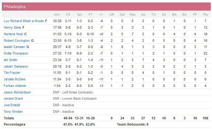 Sans oublier les 12 points et 14 rebonds d’Hassan Whiteside et les 18 points à 7/13 de Dwyane Wade, qui contribunte également au fait que l’équipe d’Erik Spoelstra (55% de réussite sur le match à conserver son 7e spot de la Conférence Est. Le coach de la franchise floridienne a d’ailleurs précisé que Chris Bosh (vcitime d’une embolie pulmonaire qui a mis fin à sa saison) devrait bientôt sortir de l’hôpital pour rentrer chez lui. Hollis Thompson mène les troupes du côté de Philadelphie avec 22 points. Miami domine largement le match au rebond avec un avantage 45-33.