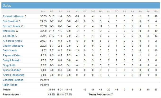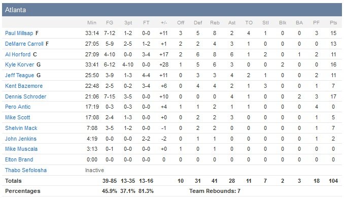 Sans Rajon Rondo (suspendu pour un différend avec son coach au match précédent), Chandler Parsons et Tyson Chandler (blessés) les Mavericks se sont inclinés 104-87 à la Philips Arena d’Atlanta. Dennis Schröder a bien rattrapé le petit match de Jeff Teague (malade, il signe 11 points à 3/9 et 4 passes) en sortie de banc et termine à 17 points (7/15, 4 passes) dans un match ou 5 autres joueurs des Hawks ont atteint ou dépassé la barre des 10 points. Monta Ellis termine meilleur marqueur de Dallas (qui perd son premier match en 4 rencontres) avec 19 points.