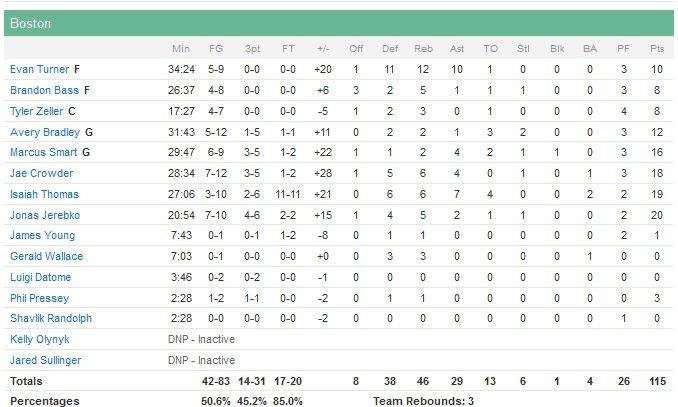Premier triple-double en carrière pour Evan Turner, qui termine à 10 points, 12 rebonds et 10 passes cette nuit dans la victoire 115-94 des Celtics face aux Knicks. Isaiah Thomas marque lui 19 points pour ses débuts au TD Garden alors que Jae Crowder ajoute 18 points, Jonas Jerebko 20 et Marcus Smart 16 face à une équipe de New York qui prend un énorme éclat en deuxième mi-temps en encaissant un 20-0.