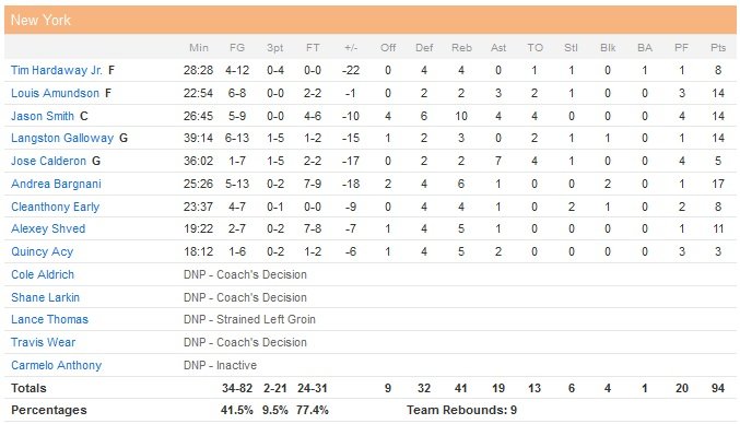 Andrea Bargnani est le meilleur marqueur des Knicks avec 17 points. Suivent Lou Amundson, Jason Smith et Langston Gallow avec 14 points chacun. Un équilibre qui permet dans un premier temps aux visiteurs de prendre l’avantage à la pause, 49-48. Amundson donne 6 points d’avance aux siens (68-62) en milieu de troisième quart-temps puis l’attaque des Knicks va peu à peu s’effondrer pour laisser place au festival Boston. Un jumpt shot de Bargnani à 2″59 de la fin du troisième quart place New York en tête pour la derrière fois du match, 72-71.