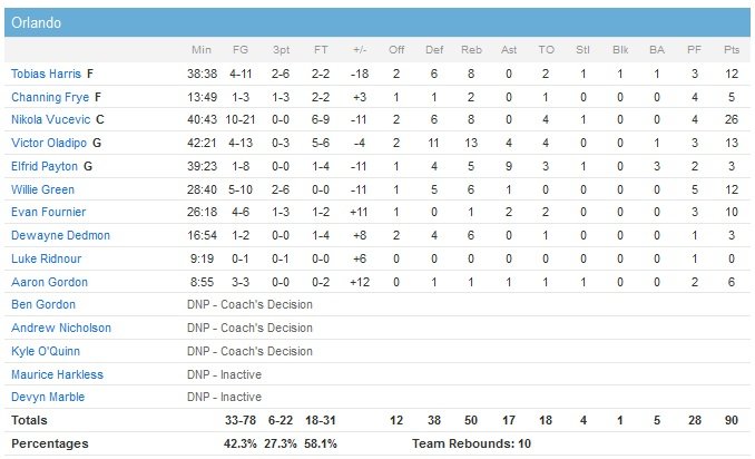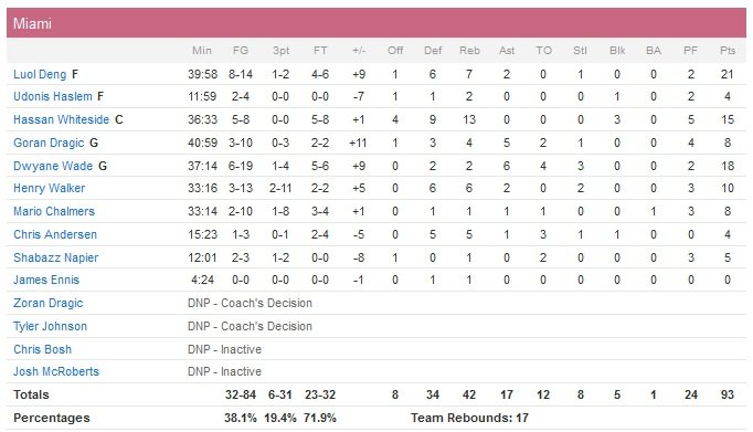 Hassan Whiteside ajoute 15 points et 13 rebonds face aux 26 points à 10/21 et 8 rebonds de Nikola Vucevic (qui marque tous les points de son équipe en prolongation avec 5 unités) et Miami gagne son 3e match en 4 rencontres et compte désormais 3 victoires pour 1 défaite sans Chris Bosh. Victor Oladipo enregistre lui aussi un double-double (13 points à 4/13, 13 rebonds record en carrière et 4 passes) mais Orlando a gâché une avance de 8 points alors qu’il restait moins d’une minute à jouer et paye son 18/31 aux lancers-francs. Les deux équipes manquent de réussite en première mi-temps et Orlando mène 40-36 à la pause. Orlando va conserver une courte avance jusque dans le quatrième quart-temps, menant 73-71 à 3″33 de la fin du troisième quart. Miami reste proche mais manque quelques occasions, à l’image d’une violation des 24 secondes alors que le score est de 77-74 en favuer du Magic. Deux lancers de Tobias Harris et un layup de Willie Green donnent ensuite 7 longueurs d’avance aux locaux, 81-74.