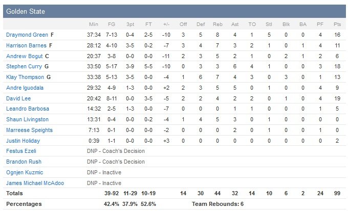 La première mi-temps est disputée entre les deux équipes, qui s’échangent 8 égalités et 12 changements d’avantage. LeBron James inscrit 13 points dans les 12 premières minutes et compte 24 unités à la pause. Devant 61-56 à mi-temps, Cleveland va prendre le contrôle dans le troisième quart. James y inscrit 12 points (dont deux 3-points) et trouve Mozgov qui rentre un jump shot pour enfoncer le clou, 86-70. Golden State (11/29 à 3-points contre 9/28 pour Cleveland) fait face à des adversaires sereins qui parviendront à maintenir leur avance jusqu’au bout et s’inclinent malgré un impressionnant nombre de passes décisives (32 pour les Warriors contre seulement 15 pour Cleveland) et un nombre de ballons perdus légèrement moins élevé (14 contre 16). Curry dans le dur, Klay Thompson n’a pas réussi à prendre le relais et reste bloqué à 13 points à 5/13 aux tirs dans une équipe qui a laissé passer sa chance 9 fois sur la ligne des lancers-francs (10/19 contre 29/35 pour les locaux).