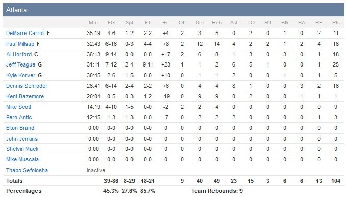 Jeff Teague (25 points à 7/12, 6 passes et 5 ballons perdus) et Al Horford (18 points à 9/14 et 8 rebonds) sont les leaders d’Atlanta, mené quasiment tout le match avant un 3-points de Teague à 4″24 de la fin du match pour passer devant d’un point, 91-90. Houston a donc échoué à obtenir une 6e victoire de rang (cela aurait été la deuxième fois cette saison) malgré 21 points de Jason Terry en sortie de banc et 18 points (8/11, 8 rebonds) de Terrence Jones dans la peinture. Houston (qui avait gagné ces 3 derniers matchs par 5 pts ou moins) prend 14 points d’avance à la fin du premier quart-temps mais les Hawks ne se laissent pas distancer longtemps et reviennent à deux points en début de deuxième quart. Seulement Atlanta retombe aussi vite dans ses travers en ratant 12 de ses 14 shoots suivants et se retrouvent avec 18 points de retard à 1″44 de la pause (59-45 Houston à la mi-temps).