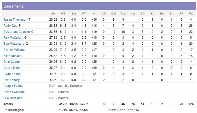 Les Kings démarrent leur seconde mi-temps sur un 27-9 qui les amène à un avantage de 44 points à 92-48 sur un 3-points de Gay alors qu’il reste 6″01 à jouer dans le troisième quart-temps. Gay Cousins (qui signe un joli 11/11 sur la ligne des lancers-francs) et McLemore ont ensuite été mis au repos pour le quatrième quart. Derrick Williams et Nik Stauskas en profitent pour se mettre en valeur avec 17 et 15 points.