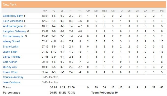 Sacramento (21V-37D) marque les 4 premiers points de ce match et ne permettront pas une seule fois aux Knicks (12V-47D) de passer devant au cours de la rencontre. L’équipe de George Karl se construit une avance de 16 points après un quart-temps et mènera de jusqu’à 44 points en deuxième mi-temps avant de s’imposer de 38 points. Alexey Shved termine meilleur marqueur des Knicks, qui shootent à 35% dans les 12 premières minutes (7/20) avec 15 points. Le deuxième quart-temps est encore plus déprimant avec un 6/24 et un 25% de réussite pour les locaux. Leur précédente pire victoire de la saison datait du 10 janvier dernier, également à domicile, contre Charlotte (défaite 110-82 soit -28).