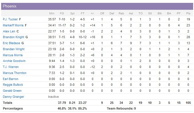 Le Magic ne se laisse pas abattre pour autant et revient à trois points sur un tir primé d’Oladipo à 1″15, 97-94. Vucevic intercepte sur la possession suivante et Oladipo trouve cette fois le layup qui redonne l’avantage au Magic, 97-96. Phoenix (dominé 54 points à 36 dans la peinture) décide alors d’accélérer avec un shoot de Markieff Morris à plus de 6 mètres qui rentre. En sortie de temps-mort, Vucevic trouve une claquette après un raté d’Oladipo et Orlando mène 99-98 à 31 secondes de la fin. Knight s’occupe ensuite d’inscrire deux lancers-francs, Orlando recolle immédiatement à 101-100 avec deux lancers d’Oladipo puis le Magic fait faute, laissant Eric Bledsoe conclure sur la ligne. Orlando (qui perd son 4e match d’affilée après avoir remporté 3 victoires de suite) va récupérer le ballon à 5.2 secondes du buzzer avec une chance d’égaliser mais Willie Green envoie le ballon directement dans les mains de Knight, pour le plus grand bonheur de Jeff Hornacek.