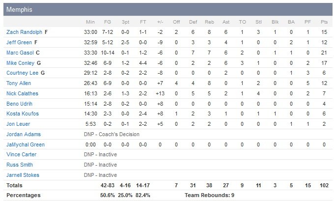 Memphis continue de fonctionner par séries avec un 10-0 pour démarrer les 12 dernières minutes (89-79) et marqué par une forte insistance dans la peinture. Pendant ce temps les Rockets ratent leurs 6 premiers shoots avant que Josh Smith ne trouve un 3-points pour réduire l’écart à 7 points alors qu’il reste 7 minutes et demi. Memphis inscrit 5 points rapides dont un 3-points de Jeff Green pour mener 96-84 en milieu de période. Devant de 12 points à 5 minutes de la fin, les Grizzlies encaissent un 14-2 (7 points de Jones) et Houston égalise à 98 partout. Courtney Lee rentre deux lancers importants dans la foulée, 100-98. Jones égalise avec un hook shot quelques secondes plus tard avant que Gasol ne tue le match.