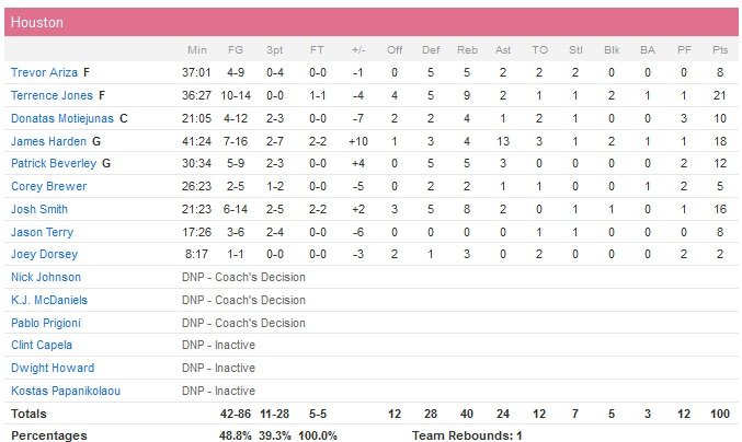 De retour après un match de suspension, James Harden est deuxième meilleur marqueur de son équipe avec 18 points (7/16, 13 passes), derrière les 21 unités de Terrence Jones. Houston rentre 5 trois-points dans le premier quart-temps durant un 18-4 qui leur offre une avance 25-13 à 5 minutes de la fin de la période, remportée 31-24 par les Rockets. Memphis score 6 points consécutifs pour démarrer le deuxième quart mais Smith leur répond par un 3-points qui replace Houston sereinement en tête, 59-54, à la pause. Les Grizzlies inscrivent les 6 premiers points dans la deuxième mi-temps et prennent rapidement l’avantage 60-59. Houston reprend brièvement la tête avant d’encaisser un 8-0 (71-65) puis d’infliger un 10-2 à leurs adversaires pour finalement revenir à 75-73 sur des 3-points d’Harden et Jason Terry. Les deux équipes reviennent finalement à égalité 79 partout avant de jouer le quatrième quart-temps.