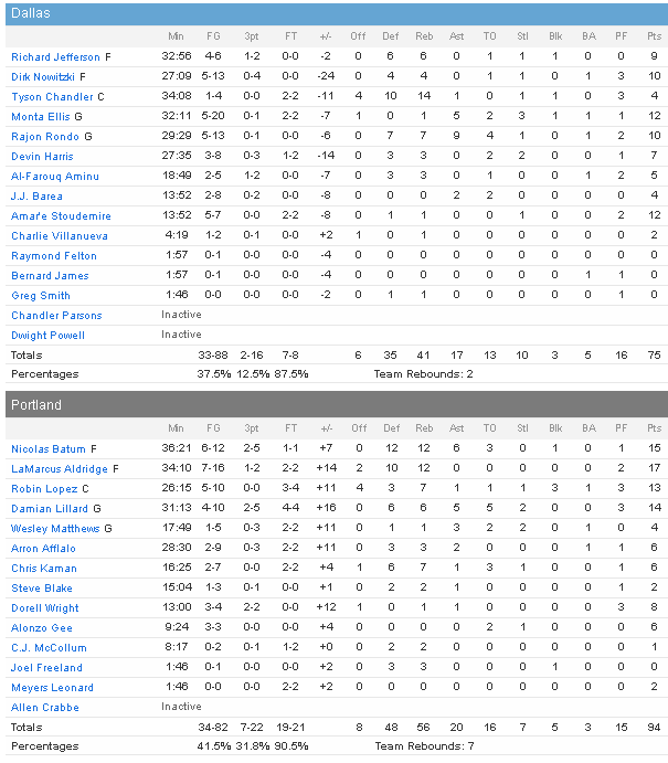 LaMarcus Aldridge a mené la danse pour Portland avec 17 points et 12 rebonds, alors que Nicolas Batum sort encore un super match avec 15 points, 12 rebonds et 6 passes. Damian Lillard ajoute 14 points et Robin Lopez 13. En face les Mavs ont connu une soirée très compliquée au niveau de l’adresse puisqu’ils ont shooté à seulement 37.5% dont 2/16 à trois points et n’ont tenté que 8 petits lancers francs. Résultat les meilleurs marqueurs sont Monta Ellis avec 12 points à 5/20 et Amar’e Stoudemire, 12 points à 5/7. Dirk Nowitzki marque lui 10 points à 5/13 exactement comme Rajon Rondo (7 rebonds et 9 passes). Tyson Chandler était lui de retour et compile 4 points et 14 rebonds.