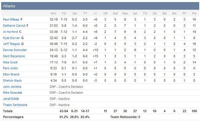 Korver, restait sur 5 échecs consécutifs (dont 4 de loin) règle finalement la mire avec deux 3-points en début de période. Le deuxième redonne 10 longueurs d’avance aux locaux, 91-81. Atlanta sera en contrôle jusqu’à la fin du match et compte 6 joueurs à au moins 10 points. Autre stat parlante, le nombre de passes décisives de chaque équipe : 18 pour les Cavaliers et 27 pour les Hawks, qui ont shooté à 51.2%.