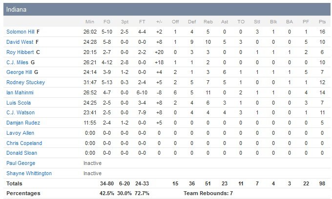 Ils parviennent ensuite à remonter 11 points dans le troisième quart-temps pour égaliser à 66 partout et prendre brièvement l’avantage en début de quatrième quart-temps sur deux lancers-francs, 68-66. Les Pacers leur répondent par un 7-0 (durant un 15-6) qui leur redonne un peu d’air 83-74 à 5″29 et Chicago n’aura ensuite plus les ressources nécessaires pour revenir à moins de 7 points.