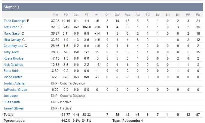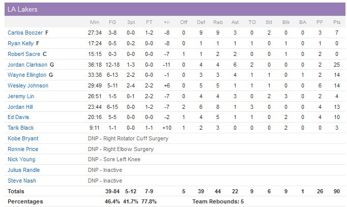 Los Angeles va prendre 8 points d’avance dans le troisième quart (8 points de Wayne Ellington) et réussir à maintenir cet écart jusque dans les dernières minutes. Le quatrième quart-temps démarre sur le score de 71-67 grâce aux derniers paniers de la période signés Jordan Hill et Ed Davis. Memphis comptera 10 points de retard deux fois en début de dernier quart, jusqu’à un dunk de Davis à 9″06. À trois minutes du buzzer, l’avance des Lakers n’est plus que de trois points, 87-84 et les Grizzlies vont enfoncer le clou avec un 13-3 (qui commence par un 7-0) pour terminer le match en beauté. À noter que Los Angeles a perdu ses trois derniers matchs contre Memphis par un total de 14 points.