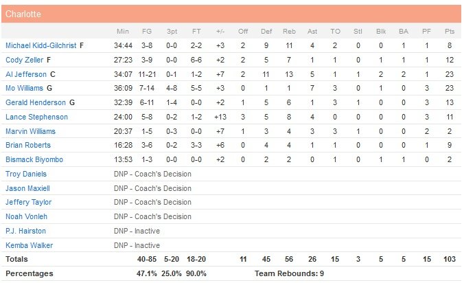 Charlotte clôt sa première mi-temps sur le score de 53 à 42 et les Raptors ne parviendront pas à s’approcher à moins de 5 points après la pause. Les Hornets mènent ainsi 80-75 en début de quatrième quart-temps avant d’enchaîner sur un 17-3 fatal à leurs adversaires et conclut par un dunk de Zeller, sur le fameux service de Stephenson à l’aveugle.