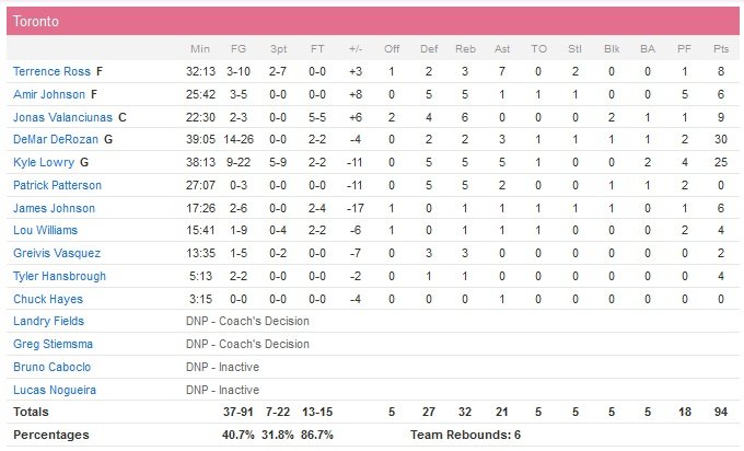 Charlotte clôt sa première mi-temps sur le score de 53 à 42 et les Raptors ne parviendront pas à s’approcher à moins de 5 points après la pause. Les Hornets mènent ainsi 80-75 en début de quatrième quart-temps avant d’enchaîner sur un 17-3 fatal à leurs adversaires et conclut par un dunk de Zeller, sur le fameux service de Stephenson à l’aveugle.
