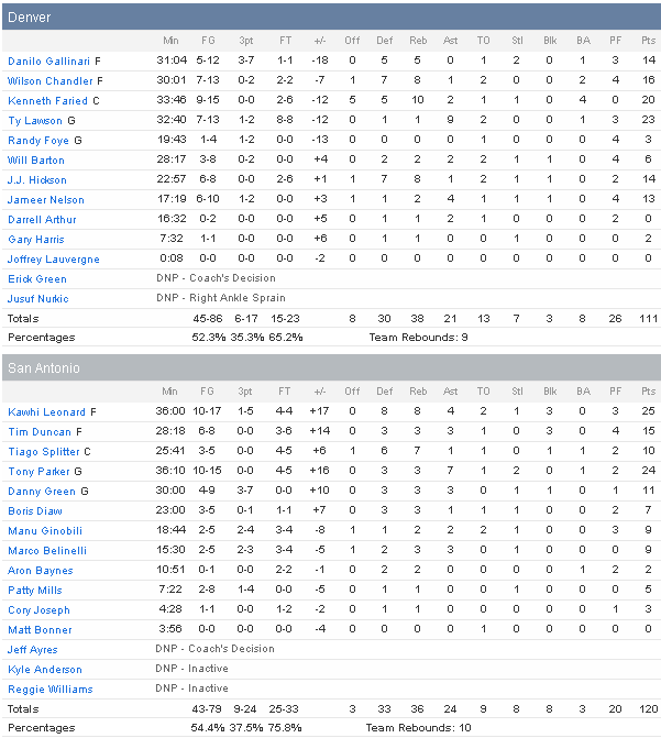 Ils ont retrouvé leur adresse et leur collectif offensif et forcément ça facilite les choses, même si cela a été compliqué. Menés par Tony Parker (24 points à 10/15 et 7 passes) et Kawhi Leonard (25 points à 10/17 et 8 rebonds), ils ont shooté à 54.4% aux tirs, pour contenir des Nuggets eux à 52.3%. Ils ont perdu seulement 9 ballons pour 24 passes décisives avec 15 points à 6/8 de Tim Duncan, 11 unités de Danny Green et 10 de Tiago Splitter. Les Nuggets de Melvin Hunt perdent donc leur premier math malgré le duo Ty Lawson (23 points, 9 passes) et Kenneth Faried (20 points, 10 rebonds), qui a reçu l’aide de Wilson Chandler (16 points), Danilo Gallinari (14 points) et JJ Hickson (14 points). Les Nuggets ont été dépassés défensivement et ont dû faire la course derrière la majorité du match mais sans jamais compter plus de 10 points de retard.