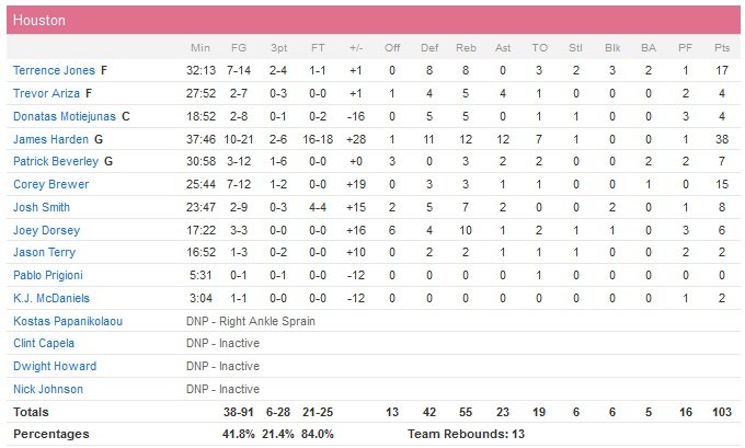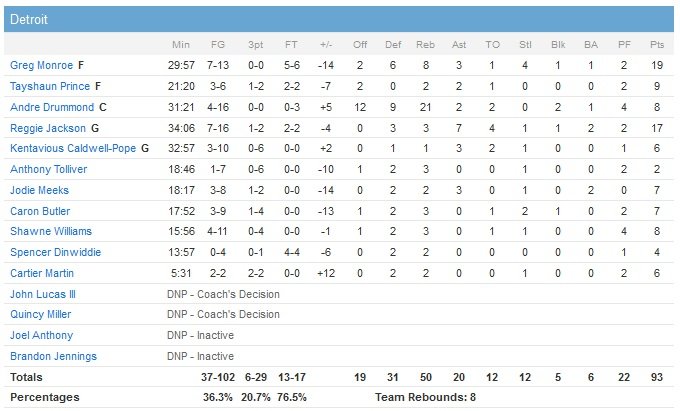Menés 29-23 après un quart-temps, les Pistons reviennent à 4 pointsà trois minutes de la fin du deuxième mais encaisse un 8-2 qui redonne 10 points d’avance à Houston (54-44) à 30 secondes de la fin de la première mi-temps. Greg Monroe (19 points à 7/13 et 8 rebonds) rentre finalement deux lancers et le score est de 54-46 à la pause. Les Pistons poursuivent sur leur belle dynamique avec un 8-2 pour démarrer le troisième quart et revenir à 60-58 à 7 minutes et demi. Après un temps-mort de Kevin McHale, les Rockets répondent par un 11-4 (7 points de Terrence Jones), 71-62 quatre minutes plus tard. Detroit manque quatre 3-points durant cette série avant d’enchaîner un 7-2 bouclé par les 3-points de Jodie Meeks et Tayshaun Prince, 73-69. Houston répond sereinement par un 7-0, 80-69 avant d’entamer le quatrième quart-temps.